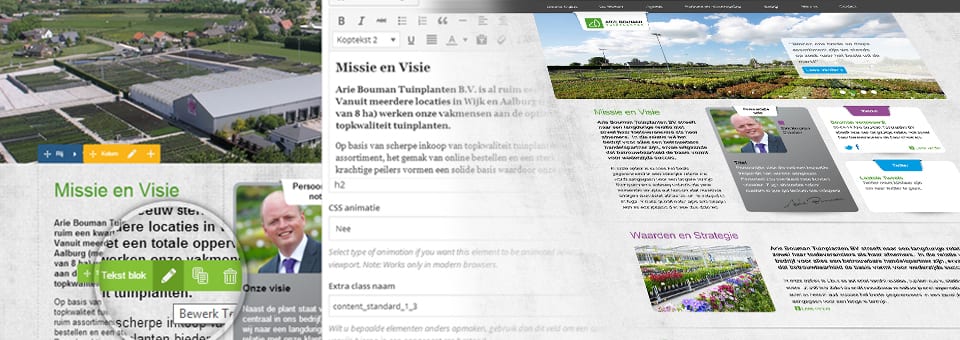 De medewerkers van Arie Bouman Tuinplanten kunnen de website eenvoudig beheren. Het beheren van een website was nog nooit zo makkelijk. Hiermee is de eenvoud van een WordPress website opnieuw overtroffen. Voorheen diende u in te loggen in de “achterkant van de website” op zo wijzigingen aan te brengen. Bij dezen nieuwe techniek kunt u eenvoudig inloggen, vervolgens bezoekt u uw website en kunt u de betreffende tekst aanklikken. Wanneer u op het potloodje klikt kunt u eenvoudig de tekst of het object beheren. Het volledige beheer van de website is in deze eenvoud opgesteld. Zo kan er via deze manier eenvoudig een pagina worden toegevoegd of verwijderd, maar kan men ook zelf de indeling bepalen op het gebied van kolommen. Kortom: het beheren van uw WordPress website was nog nooit zo eenvoudig! Daarnaast is de website volledig responsive opgebouwd en daarmee dus ook geschikt voor smartphones en tablets. Hieronder ziet u een voorbeeld van het eenvoudige beheren van de websites.